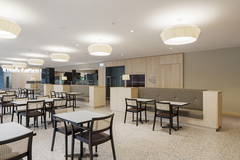 The Lyra solid wooden chair with its warm minimalism continues the factual language of the horgenglarus collection into the 21st century. It is the comfortable evolution of the compact, straight miro chair. The bold sweeps of backrest and rear legs give distinction to Lyra's geometry. Lyra is horgenglarus' most successful and, with 32 models, also our most comprehensive chair family. Thanks to a variety of seat widths, depths and heights as well as materials, the Lyra is suited for a wide range of purposes and architectural styles. A staff canteen needs a different type of chair than a café, bistro, or fine-dining restaurant. A council chamber or boardroom makes other demands than a hotel room or a private dining room. Larger hotels, restaurants, or administrative offices often combine more than one usage type in one building. Lyra's end-to-end design line offers a large variety of functions: different backrests, not only chairs, but also upholstered and lounge armchairs as well as bar stools in two heights. The seat's comfort level also varies from wooden seat or cushion to very comfortable belt upholstery.